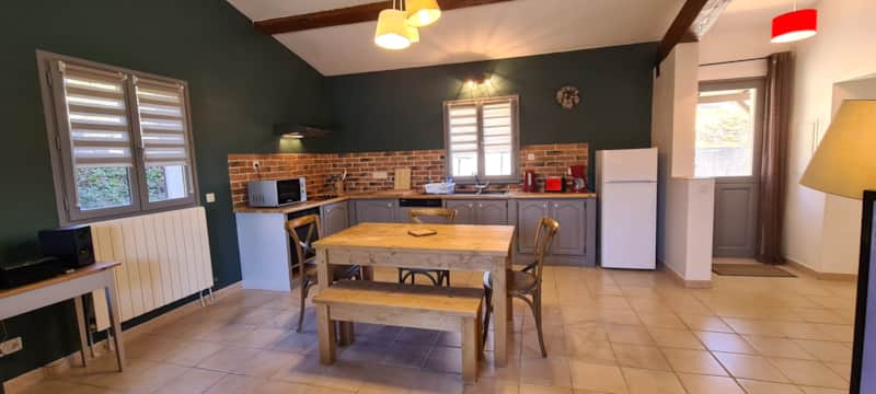 • Cuisine équipée : Cafetière, bouilloire, grille-pain, four, micro-ondes, plaques de cuisson, réfrigérateur-congélateur.
